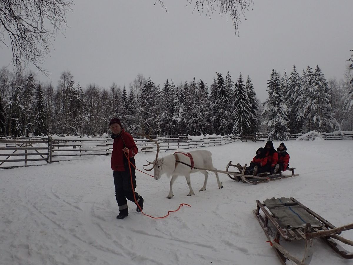 その後外に出て、3組みずつ順番にトナカイそりに乗りました。