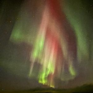 ガイドさんの手厚いサポートや暖かいお茶のおかげで快適に過ごし、待機しているとついに空にグリーンとレッドのオーロラが現れました。最初はかすかでしたが、次第に空一面に広がる壮大な光景へと変わり、その美しさに感動しました。