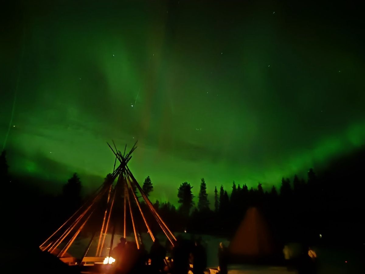 火の側で暖まっていたら、ガイドの方に呼ばれて空を見ました。辺りが明るく照らされ始めたと感じたら、すぐに光がゆらゆらと広がり、真上からも降ってくるようなオーロラが見られました。たぶん2.3分の出来事だったと思います。