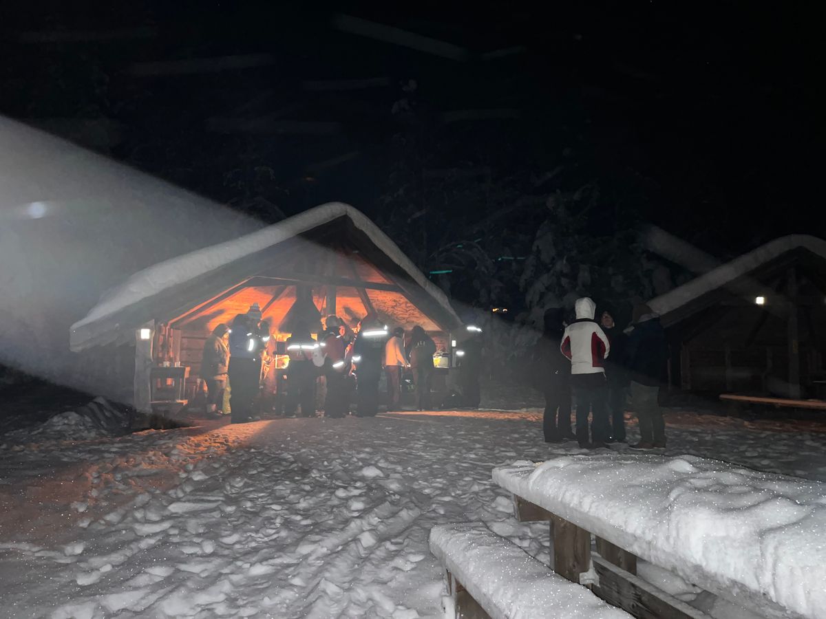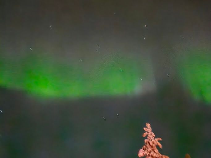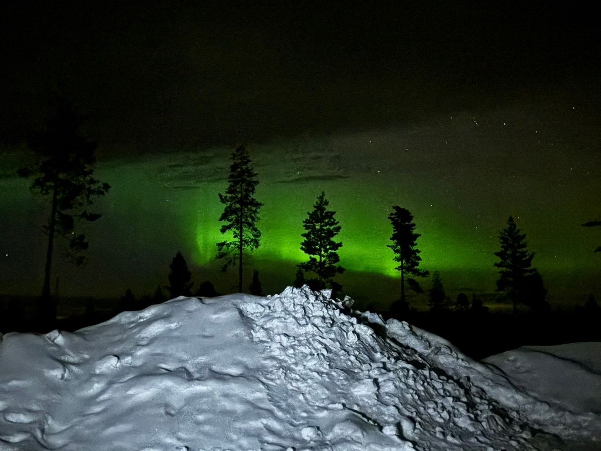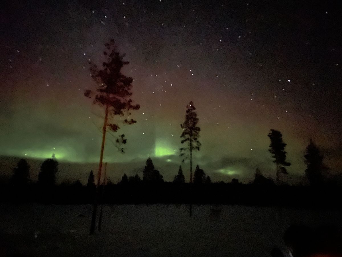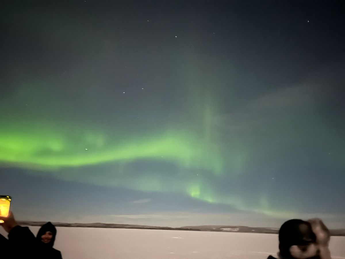 肉眼ではほぼ見えなかったのですが、写真で撮ると映る程度...。まぁ仕方ないかと諦めてBBQエリアで暖をとっていたところ、オーロラが見えたとのこと!急いで駆け寄ると肉眼でもはっきり見えるオーロラが!!みなとても興奮していました!