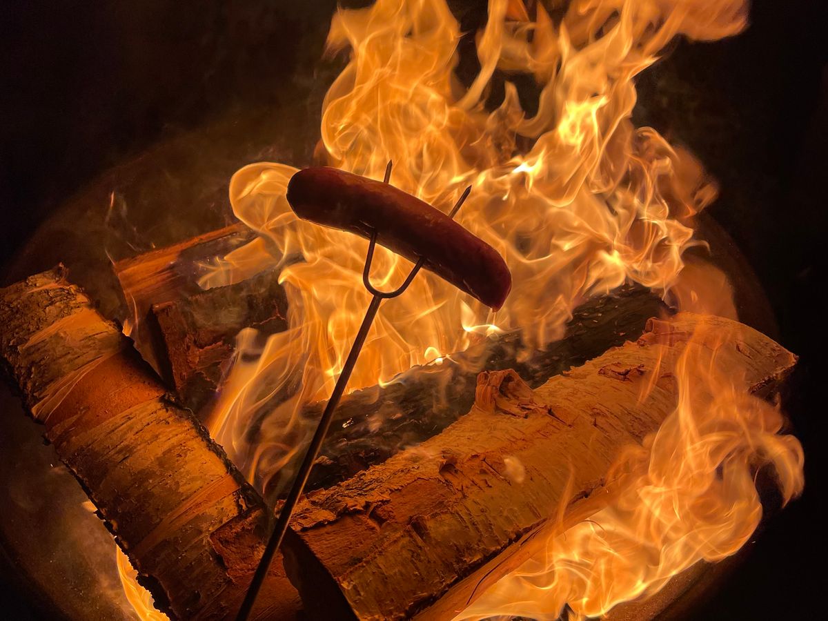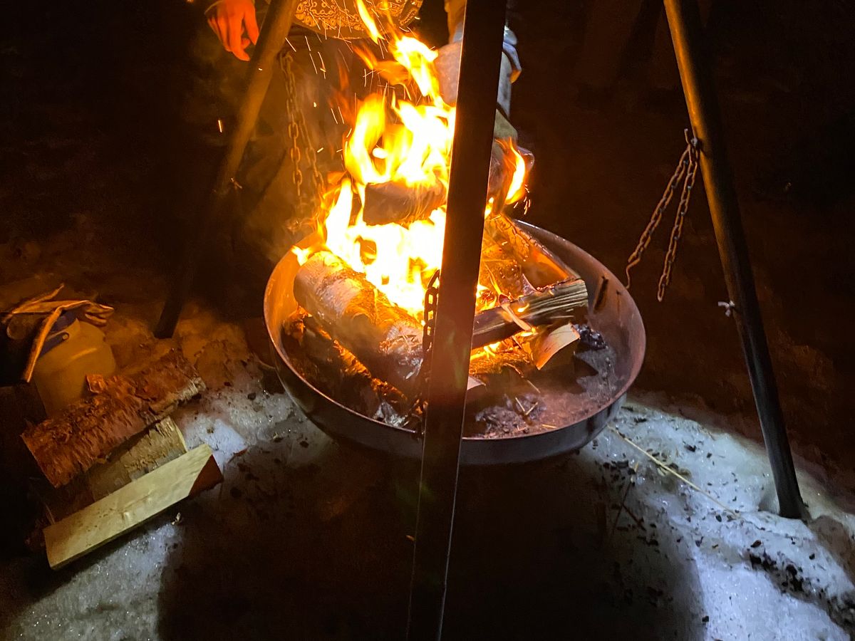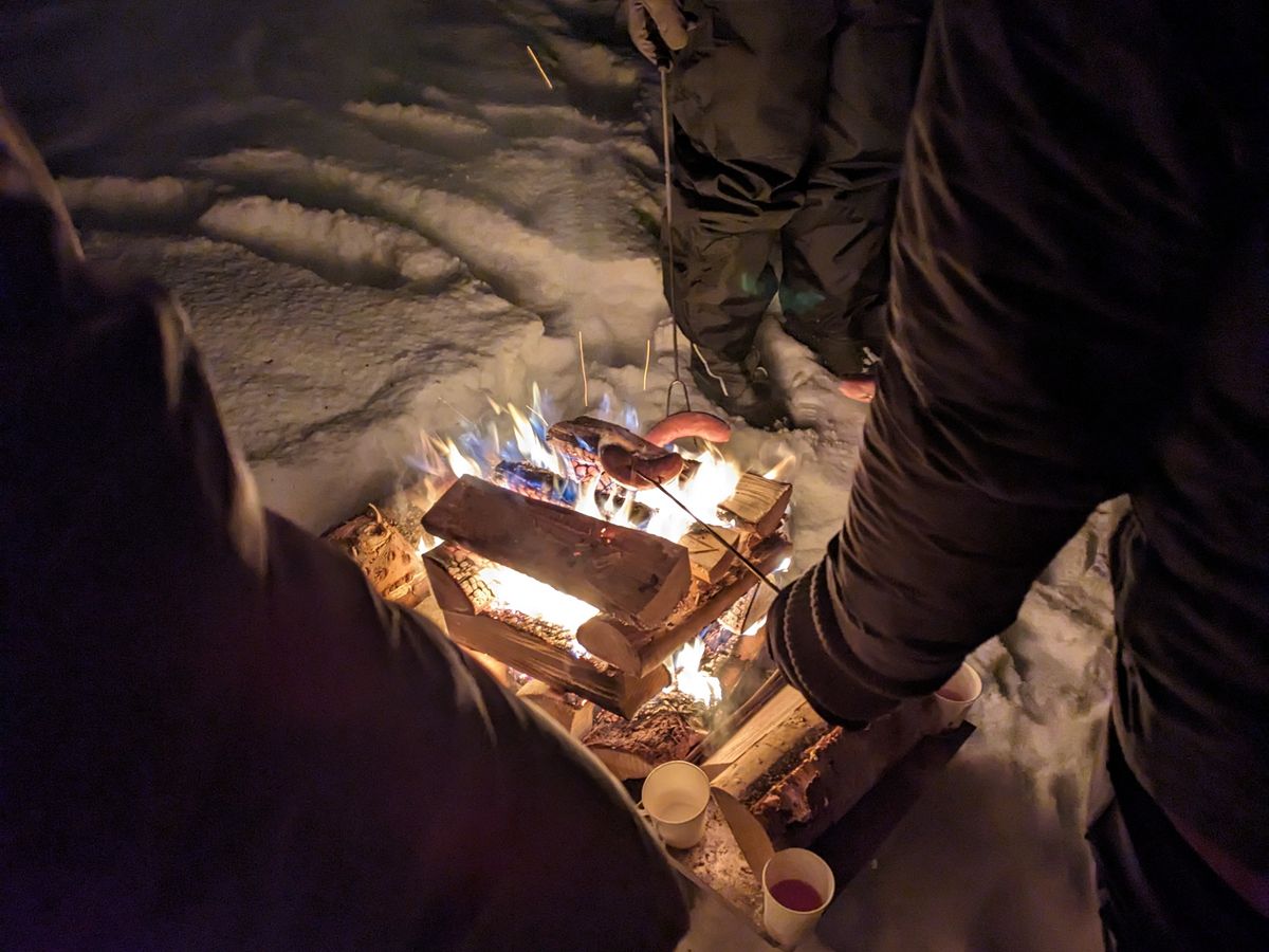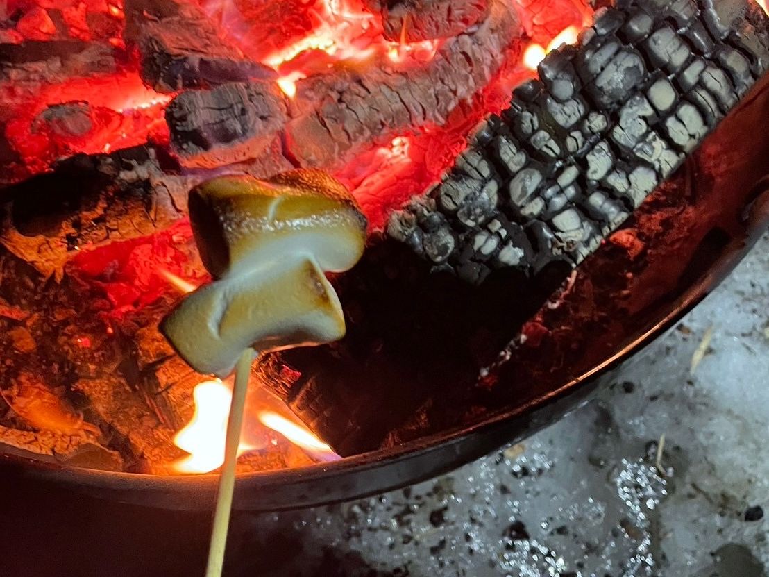 火をみんなで囲んで、いただいたものを串に刺して火に当て、楽しみました。テント内は暗いため、ソーセージが焼けこげても気づきにくいです。周りの人が焦げ付いていてそれでも焼いているのがとても面白く、今年初の大笑いをしてしまいました。