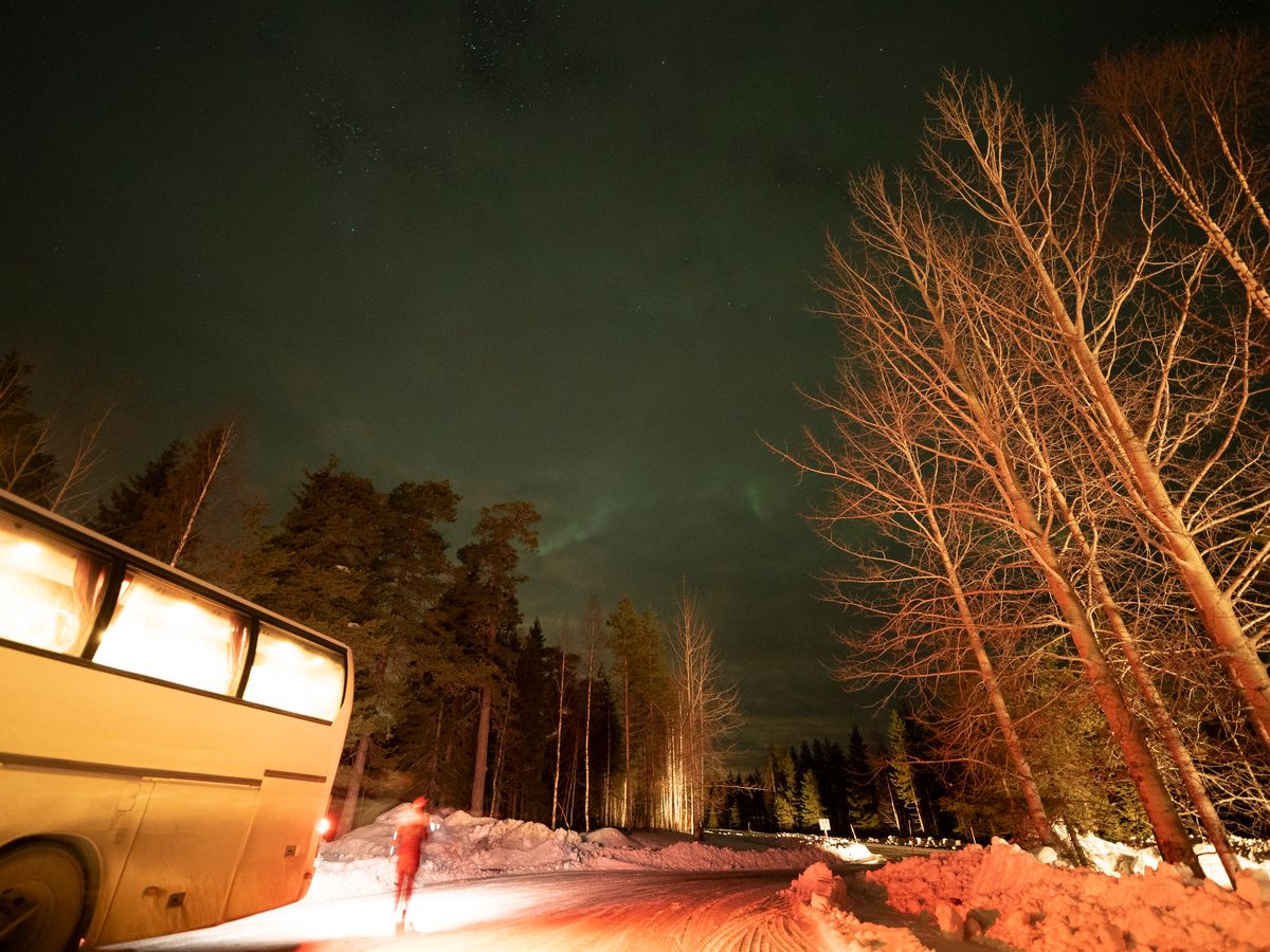 集合後バンに乗って1時間ほどはしりオーロラ鑑賞兼バーベキュースポットに連れて行ってくれます。ただガイドはシートベルトもせず雪道をながらスマホしながら猛スピードで走るので恐怖を感じました。我々は怖いのでシートベルト着用しましたがフィンランドでは義務ではないのかもしれません。ただ別の会社のツアーでは乗客にもシートベルトするように指示してました。