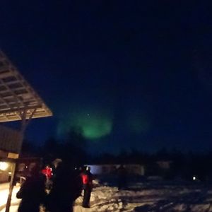 私たちは、何よりオーロラを見たかったので、暗いところを探して、ひたすらに空を眺めてオーロラ待ちをしました。キャンプファイヤーや小屋の明かりで、真っ暗な場所がなかったのは少し残念。オーロラをじっくり見るにはもう少し暗い必要があるようには思いました。しかし、この日も運がよく、うっすらではありますが、オーロラをみることができました。