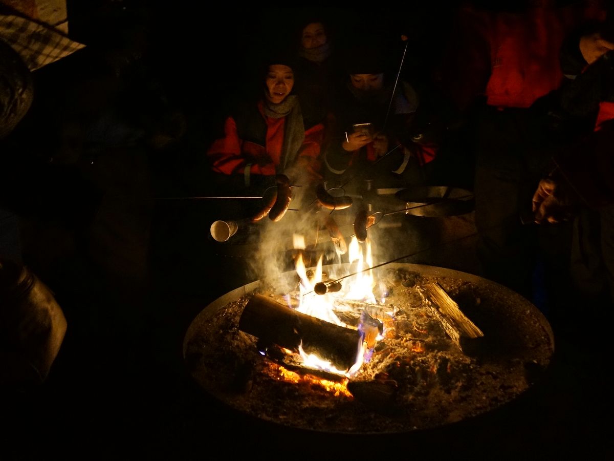 ガイドのお兄さん、お姉さんが待っている間にコーヒーを用意してくれたり、暖炉で焼いたソーセージを準備してくれたりと、寒い思いはしませんでした。