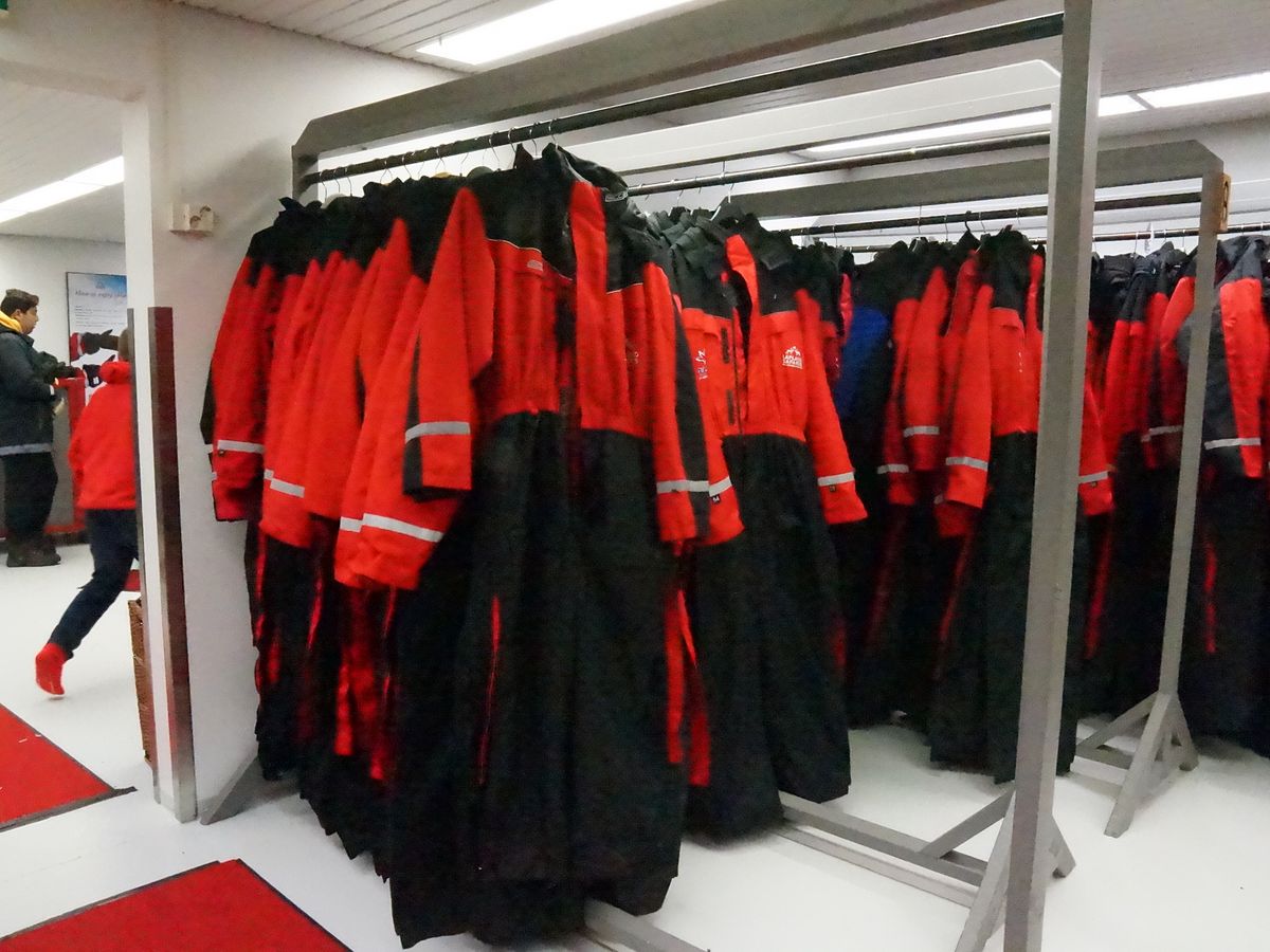 集合後、まずはウェアを借りるところから始まります。私たちは、しっかりと着込んだ上にスノーボードのウェアを着て、その上にオーバーオールのような、宇宙服のような防寒着を着ました。これでも、長時間外にいると底冷えするほど、冬のラップランドは寒いのです。