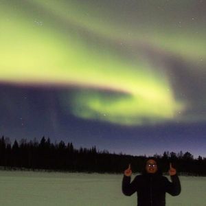 2回目です。今回は-10℃程で、比較的暖かく、風も少なく、オーロラ観測にはgoodでした。凍った湖の上で、静寂の中、氷の下の水の動く音、数分毎に起こる流れ星、ゆらゆら動くオーロラ(薄い物でしたが)最高。