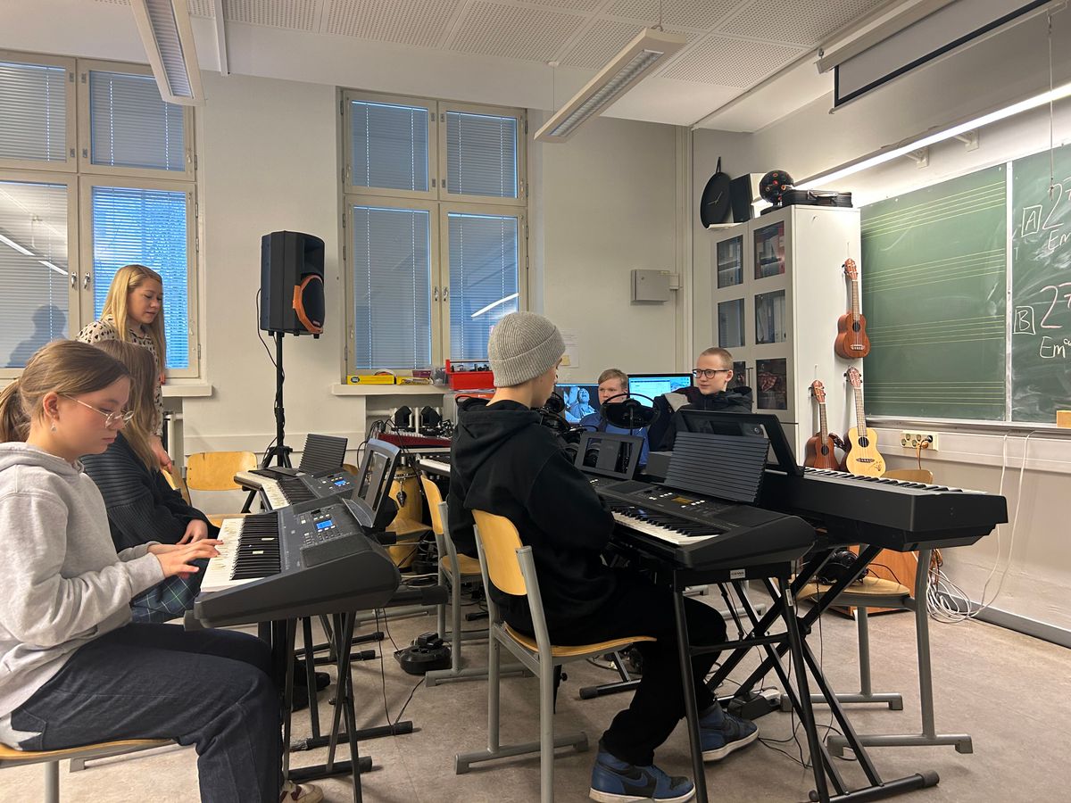 YouTubeの音源を元に実際にドラム、キーボード、ギター、エレキギターで演奏する授業を見学させて頂きました。先生は生徒の意見を聞いて、生徒がどのように演奏をしたいかを常に聞きながら進めている印象でした。そのため生徒たちも積極的に自分の意見を述べていて、7人ほどと少人数のクラスであることもあり、対話的な場面が非常に多かったです。