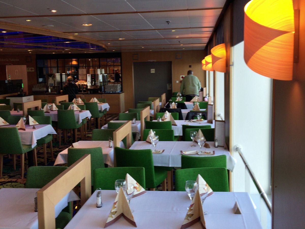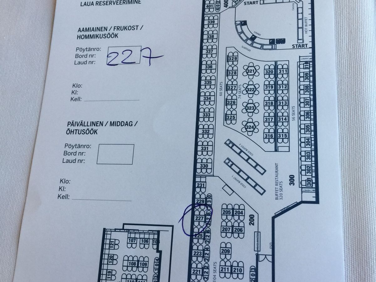 18時台の帰りの便はビュッフェ付きにしていました。タリンには、明るくて居心地の良いカフェや気軽に入れる小ぶりなビストロがたくさんあり、散策ついでにちょこちょこ立ち寄ったりしてしたので、フェリーに乗り込む頃にもまだお腹がすいておらず正直、失敗した!と思っていました。しかしシーズンオフの土曜日ということもあり、船内は9割がフィンランド人。行きのまったりした雰囲気はどこへやら、あっちこっちで飲めや歌えの大騒ぎ(同じフロアでカラオケ大会もやってました)。ビュッフェ会場ももちろん飲めます(ワイン、ビールが飲み放題)が、女性、子供が多いせいか別世界です。ひとり旅で、やや旅疲れしていたこともあり、事前に予約しておいて良かったとすぐに思い直しました。この辺りは好みでしょう。なお、チケットセンターで乗船チケットと食事チケットを発券してもらう際、係の人がビュッフェ会場の場所を口頭で教えてくれますが、船内図を見ておくか行きに確認しておくと良いと思います。会場のオープンは出航の15分前。席番号を教えてもらい、座席表を見て自分で席を探します。味はまあ普通、かな。。お皿はこまめに片付けてくれます。到着まで過ごせますが、だんだん寂しい感じになっていきます。早めに乗船フロアに降りておくと帰りが楽です。