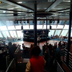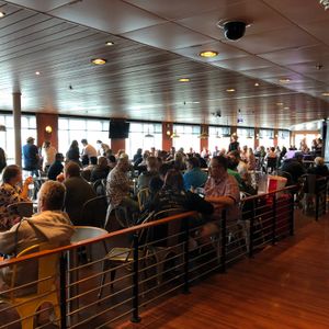 丁度良い時間に移動するため、船内は椅子に座れない人も多数いた。また、ディナーを事前に予約するとスムーズに入れ、確実に座席を確保できる。