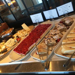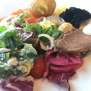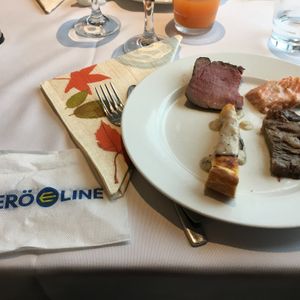 帰りの便には8階ブッフェを利用。フィンランド料理が主。コールドミール(サラダ、サーモン、エビ、キャビア2種、ニシンの酢漬け…)、ホットミール(サーモン、ハンバーグ、ミートボール、タラ、ローストポーク、ローストビーフ、ローストチキン、ジビエっぽいお肉…)どちらも豊富。アルコール(赤白ワイン、ビール)もソフトドリンクも豊富。食事は下船時にもまだ残っていたので、慌てなくても大丈夫でしょう。予約なしでも大丈夫そうでしたが、予約をしていると確実に席が確保され安心です。