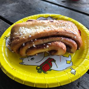 大きなソーセージ一本とガイド手作りのシナモンロール(大きい!)を食べ、飲み物(コーヒーまたは紅茶)をいただきました。
