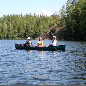 今回の参加者は、ロシア人のカップルと、ロシア人のお嬢さん2人と、私たち3人の全部で7人。皆、帰りの時間にしばられていなかったので、ゆったりと漕ぎ、ゆっくり休憩(クランベリージュースとシナモンロール・カレリアパイ、コーヒーをいただきました)し、途中、カヌーを湖から湖に自ら運ぶ際に見つけたワイルドブルーベリーを採って食べ、またゆっくりと漕いで、スタート地点に戻りました。