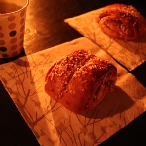キノコ狩りができなかったのは残念でした。雨のため火を焚くことができずバーベキューができないことになっていたのですが、その場所に行くと火が熾きていてシナモンロールとこの地方では定番のお粥の入ったパイ「カリヤランピーラッカ」でコーヒーブレイク。