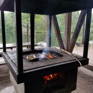 ブルーベリーやリンゴンベリー、きのこを採りながら2~3時間歩いた後、休憩所の暖炉で焼いたソーセージや、採りたてのキノコを食べて腹ごしらえをしました。