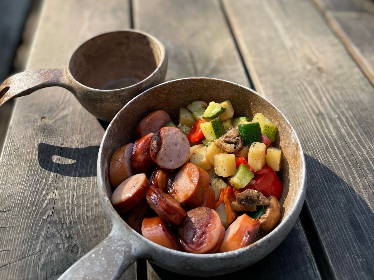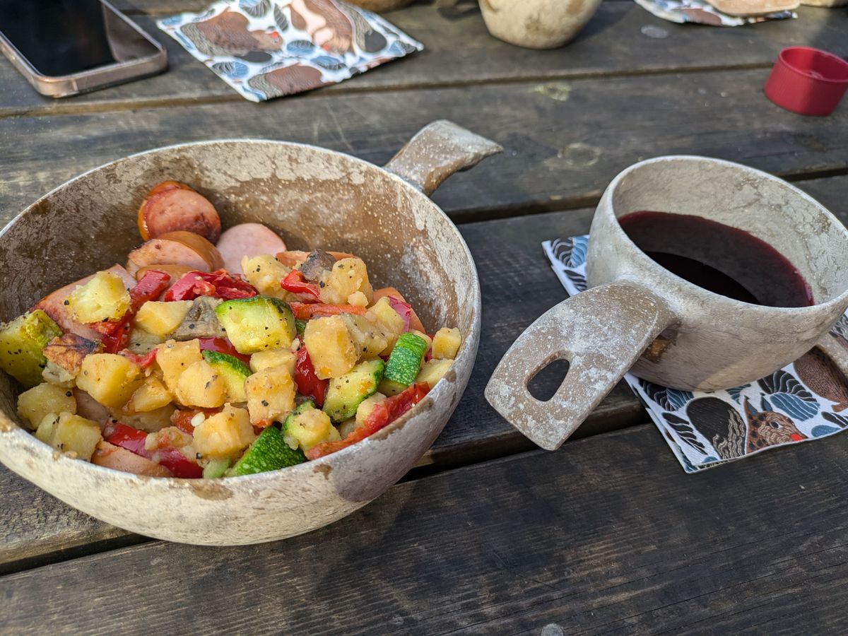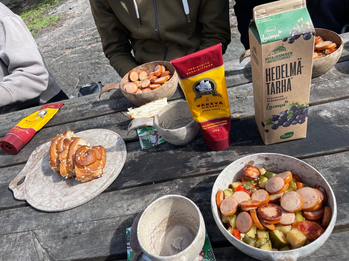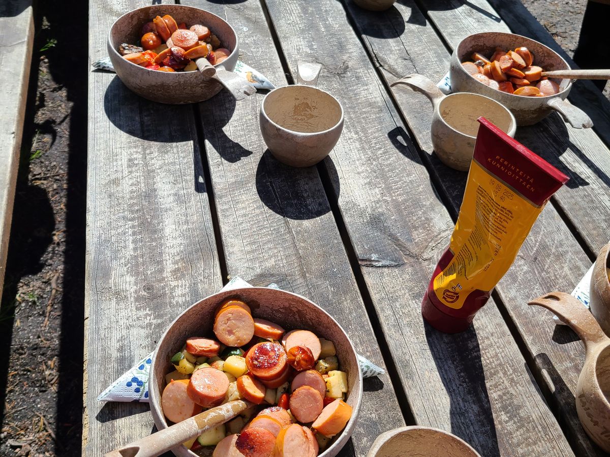 ご飯は最高のBBQで、カリッとしたソーセージとマリネされた野菜蒸しでした。それにフィンランド特製のマスタードを乗せて食べる。景色はいいし、味は美味しすぎるし、最高です!!