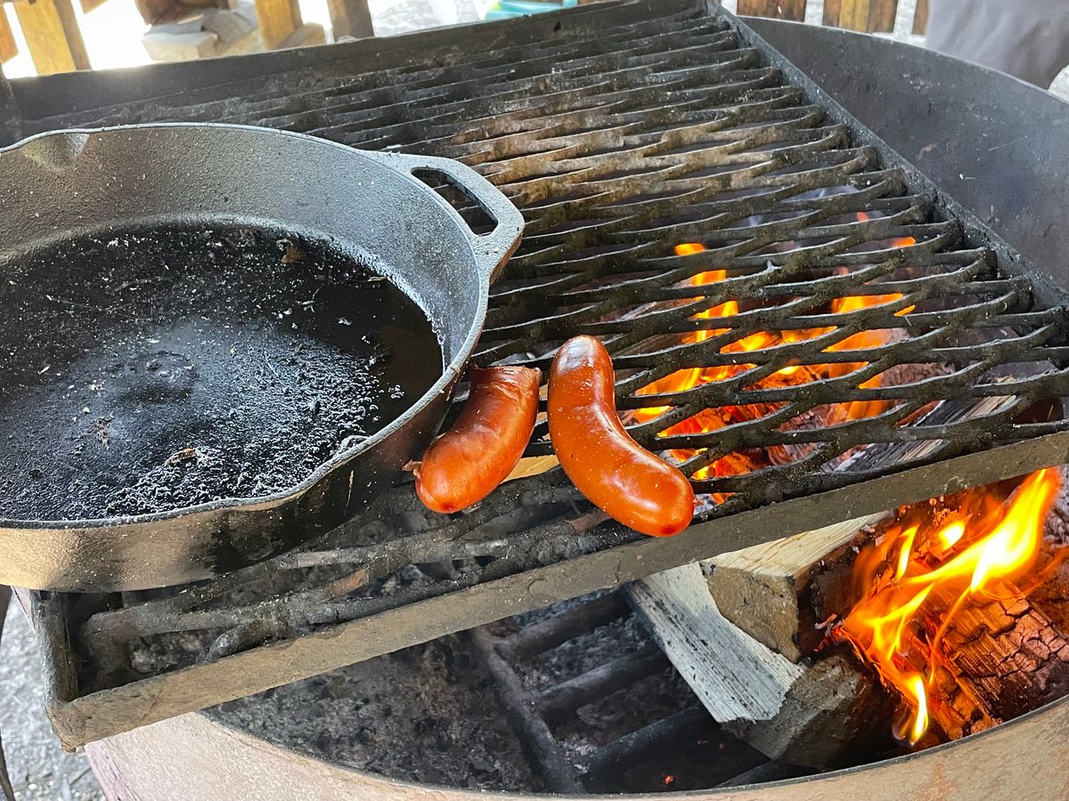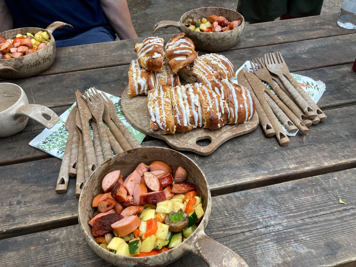 トレッキングコース中、火を使えるバーベキューエリアに着くと、ジェフのリュックサック内の調理器具とバーベキュー施設を利用してランチを作ってくれました。ブルーベリージュースとソーセージとジャガイモなどの炒め物、紅茶と甘いパンのランチです。時刻は2時半ごろだったと思うので、結構お腹が空いていたのでペロっと食べられました。