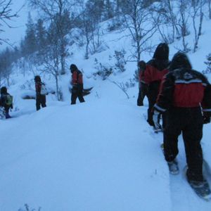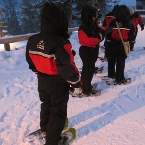 念願のスノーシュー初体験でした。参加したのは12月の末(クリスマスシーズン)で、極夜の季節であったため、薄暗いうちからの出発となりました。ガイドさんにスノーシューの履き方を教えてもらい、簡単な歩き方の説明の後、出発。2~3kmを1.5~2時間で歩きます。当日は日本人ばかりの10人弱のグループでした。