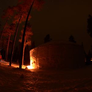 観測ポイントでは初めに雪と氷で作られた小屋(?)の様なところに通され、中に入ると天気の良い日に撮影されたオーロラの動画が天井に映し出されていました。そこで、オーロラや小屋についての説明がありましたが、外の様子が気になっていたので、説明の時間がもの凄く長く感じました。実際には10分程度でしょうか。その後、自由時間となり、各々小屋の外に出て空を眺めたり、三脚を立てて撮影したりしていました。その間にスタッフの方がソーセージとホットベリージュースを振舞ってくれました。