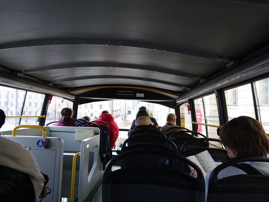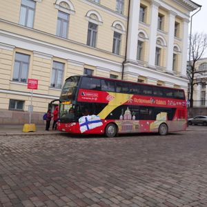 ヘルシンキの市内を2時間弱で回るツアーバスです。集合時間になるとそれとわかるバスが到着しました。バウチャーを見せ、イヤホンをもらい、着席します。2階の席が人気です。おそらく夏には2階の屋根がオープンになりそうです。イヤホンで言語を選ぶとそれぞれの場所で説明を聞くことができます。2回の写真ストップがあり、ヘルシンキの市内を効率よく見て回るのに時間もちょうどよい感じです。