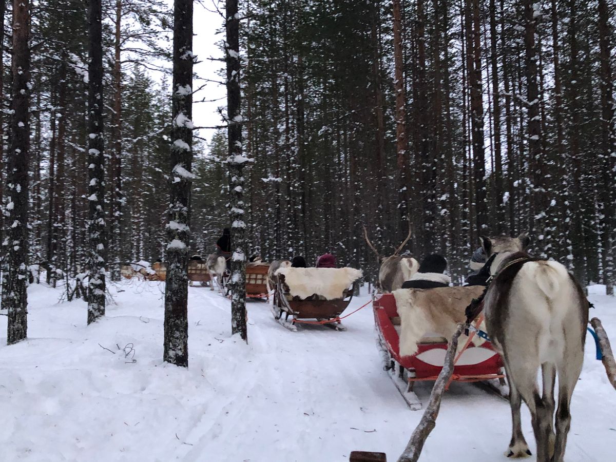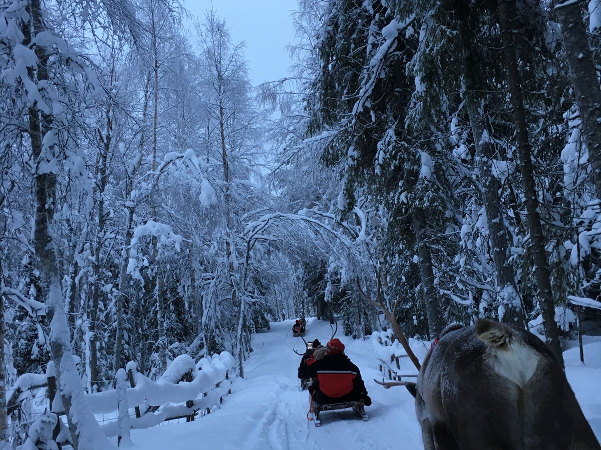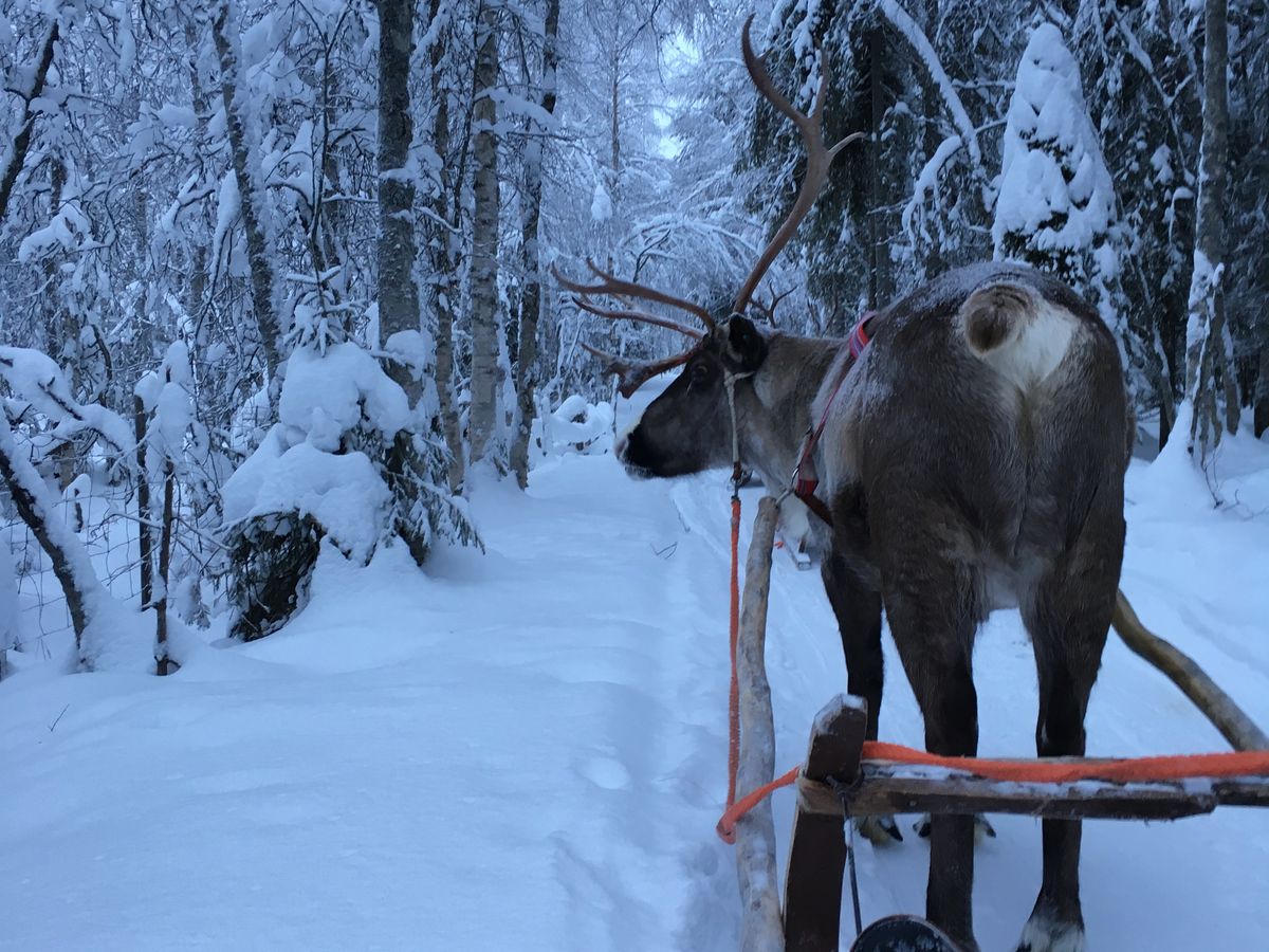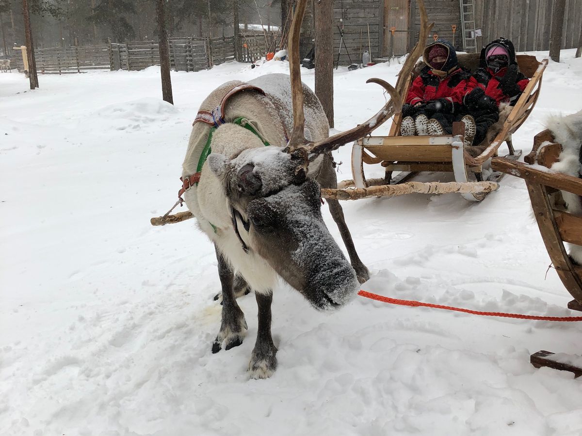 雪景色の森をトナカイぞりに乗っているのはアナ雪そのもの。しかも私たちの乗ったそりの後ろのそりを引くトナカイが常に真横を並走する形で、それこそ角当たりそう、鼻息もかかるくらいの間近でとっても楽しかったです。せっかちなトナカイ(名前が難しく覚えられなかったので勝手にスヴェンと命名)に感謝です。