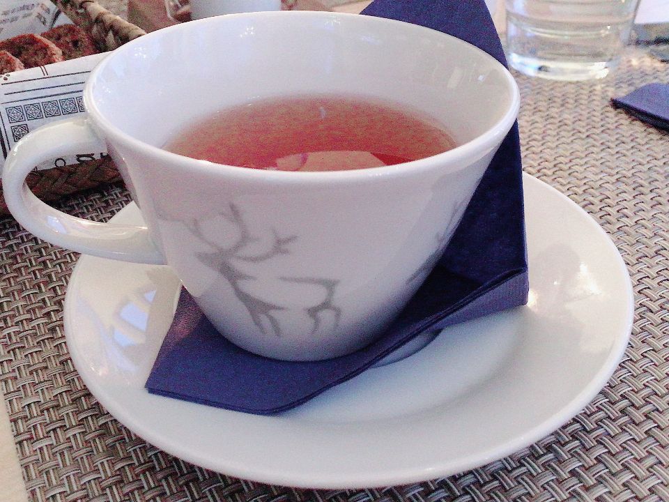 サラダ、パン、サーモンスープ、デザート、コーヒー、紅茶