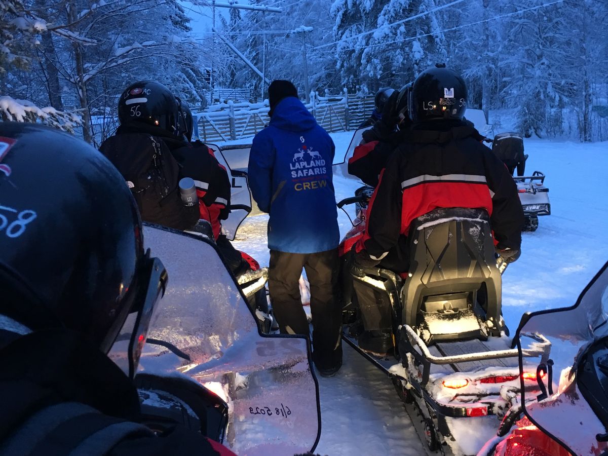 郊外のスカイホテル オウナスヴァーラに泊まっていたため、ホテルまで送迎があったのが、とても助かりました。ホテルのロビーまで青い防寒具を着たツアースタッフが迎えに来てくれます。ツアーオフィスでブーツ、グローブ、靴下、ネックウォーマー、目出し帽、ヘルメットなどを借り(ツアー料金に含まれている)装備は完璧。快適にすごせました。着て来た防寒着などはツアーオフィスで脱いで置いて行きます。リュックなどは一人1つまで持って行けます。トナカイゾリの後私服に着替えてサンタ村に行きますが、ツアー中借りておくことも可能のようですし、結構着たままの人もいました。