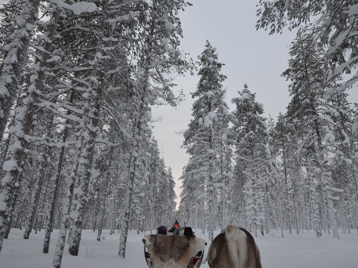 静寂の中、トナカイさんと一緒にゆったりと時間が森の中で流れてゆき、雪に覆われた神聖な景色を眺めながら森の美しさをとても感じました。