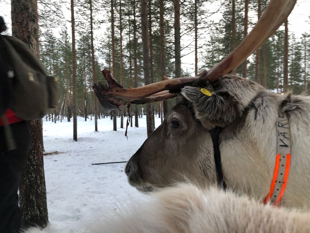 ほとんどのトナカイの角は切られていましたが、私達のトナカイは片方だけ立派な角があり、時々振り返って歩いていました