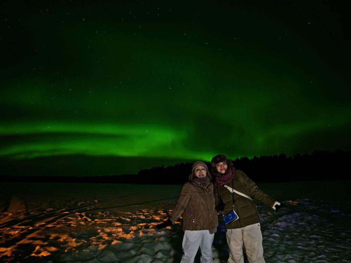 当日はガイドのDmyさんによると私たち以外の参加者が他に18名程いたが全員キャンセルになったと聞き、迎への車の出発時も雪が舞い散っており、私も姪っ子もオーロラ観測はほぼ諦めてコテージでBBQをする想い出作りの気持ちで参加しましたが、何と!美しいオーロラが波打ち何度も何度も現れてきて、感謝感激でした。しかも、参加者が私たちだけのプライベートツアーになっていたので、特別にガラスのコテージの中でBBQというサービスになり、ふたりだけだったのでガイドさんのカメラで何度も撮影してくださり、連れて行った姪っ子も喜んでくれて本当に行った甲斐があった旅行でした。ガイドさんのガールフレンドのMariaさんもお手伝いに来ていてフィンランドの飲み物のサーブやオーロラが出るたびに呼びに来てくれてとてもホスピタリティに溢れていて素敵な方々でした。聴けばウクライナから来て滞在しているとのことで戦争の影響が北極まで来てるのだな....としみじみ思いました。