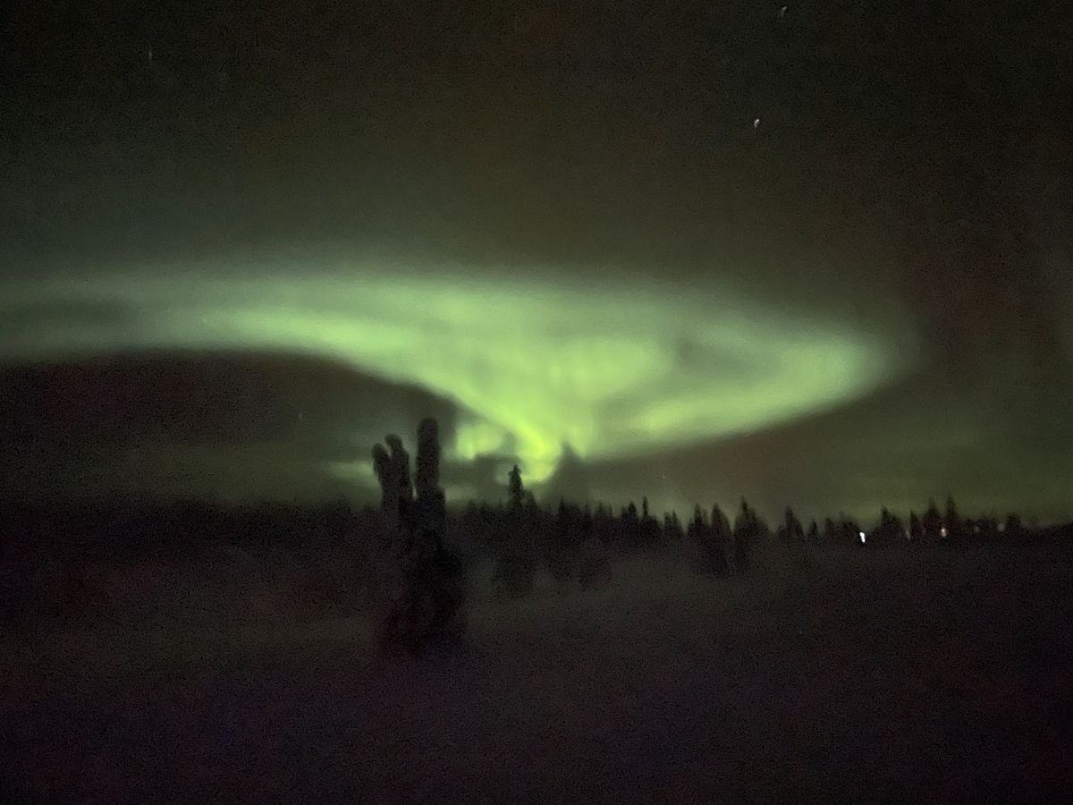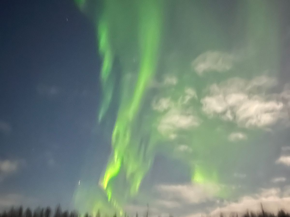 最初は曇りでほぼ満月のため月明かりも強く見れないかと思ったが、結果的に波打つようなオーロラを見ることができた。