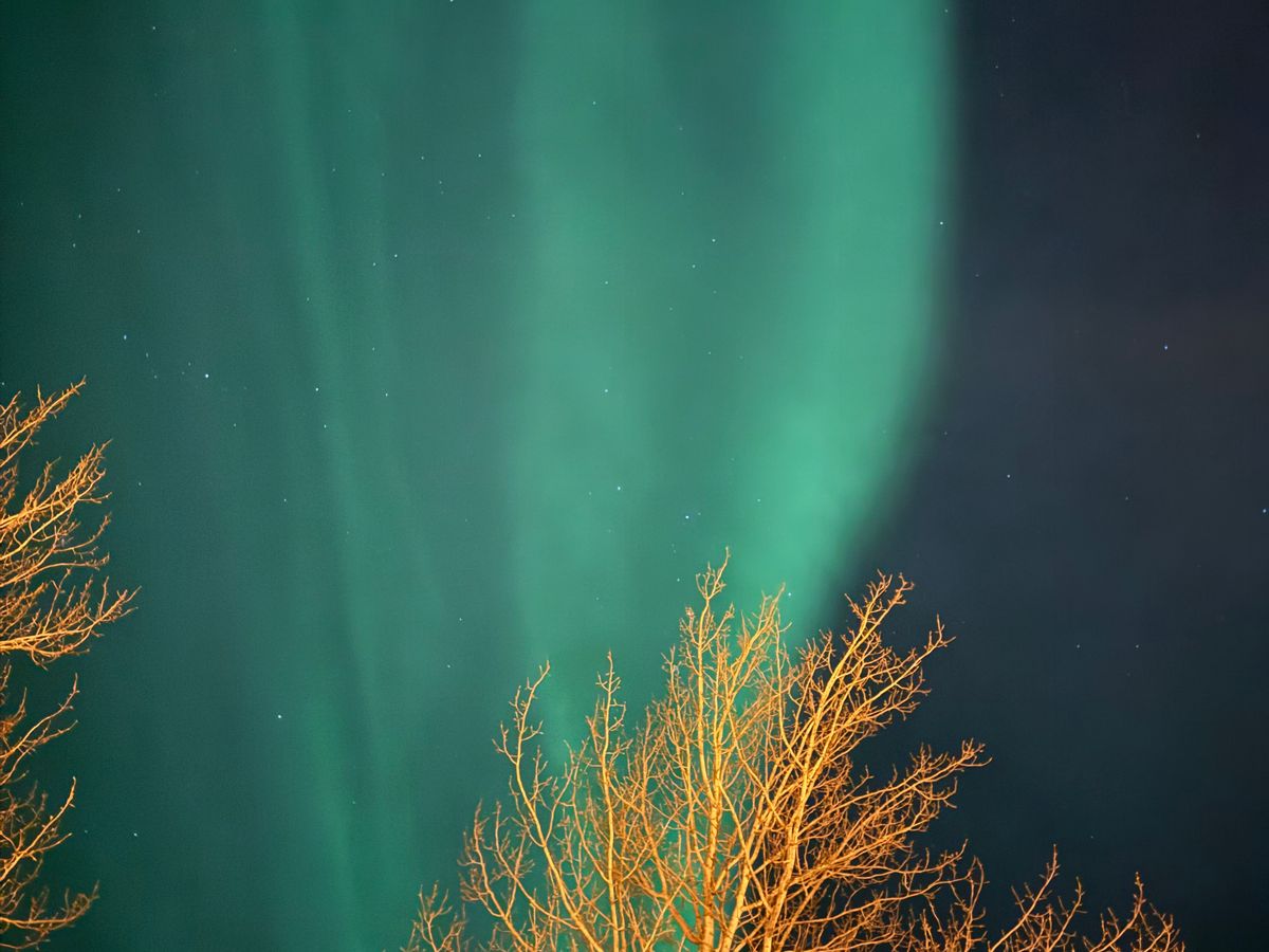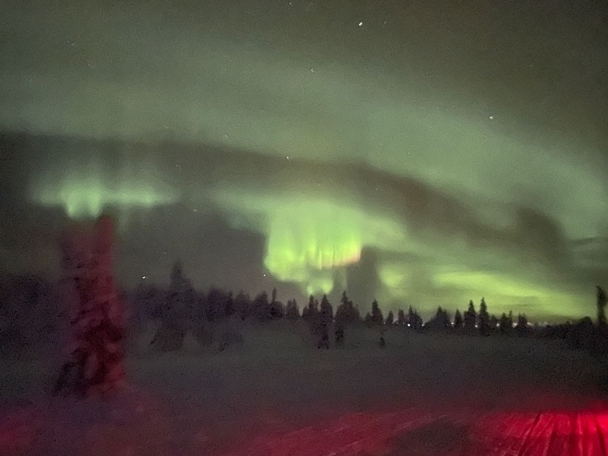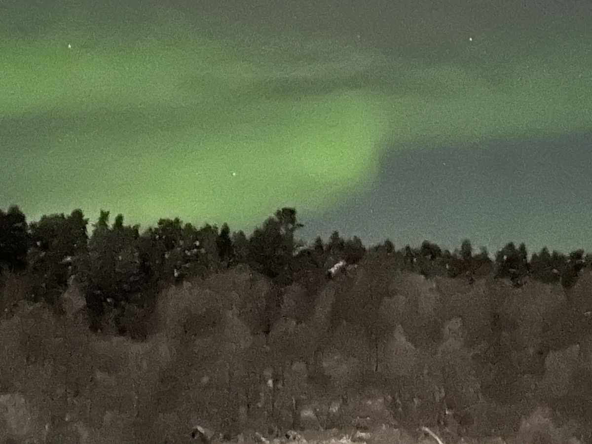 ガイドさんの手厚いサポートや暖かいお茶のおかげで快適に過ごし、待機しているとついに空にグリーンとレッドのオーロラが現れました。最初はかすかでしたが、次第に空一面に広がる壮大な光景へと変わり、その美しさに感動しました。