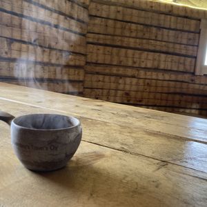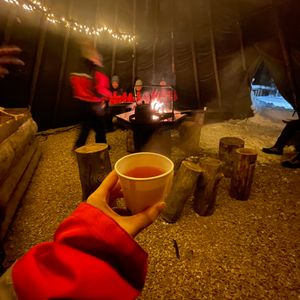 【コタでの時間】最後にコタでホットドリンクをいただきながらガイドさんとのトークタイムです。ドリンクはノンアルコールのグロッギのような風味で、スパイスが効いて甘くてとても美味しかったです。