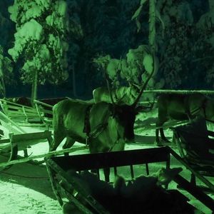 トナカイそりは、細長いそりに2人乗りでほぼ寝そべるような形で乗ります。木製のそりなので、ほぼ雪の地べたに体をつけるようになりますので、氷点下10度以上の夜だとむちゃくちゃ寒いです!なので、スキーウェアや二重三重の重ね着にカイロをつけていたとしても、レンタルで支給される防寒オーバーオールスーツは必須です。そりで動いているときはオーロラはでませんでしたが、焚き火のあるコタという小屋に到着し、しばらく体を温めていると、広場みたいなところにオーロラが出現し、かなりの時間見ることができました!今年はオーロラの当たり年みたいなこともいわれておりますが、いずれにしても幻想的な景色にしばし陶酔することができました!