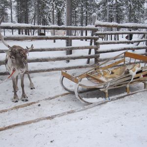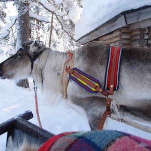 トナカイのそりは二人乗り、ちょっと窮屈です。