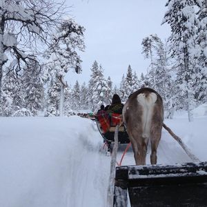 そしていよいよトナカイぞり体験スタートです。トナカイの毛皮が敷いてある、まるでサンタクロースのそりのようなそりに二人一組で乗り込みました。そりは小屋を目指してゆっくりとした歩調で木々の中を進んでいきました。スリルを求める人には物足りないかもしれませんが、非日常の体験にとても癒され、大満足でした。ゴール地点で自分のそりをひいてくれたトナカイに餌をやり、トナカイとはお別れです。