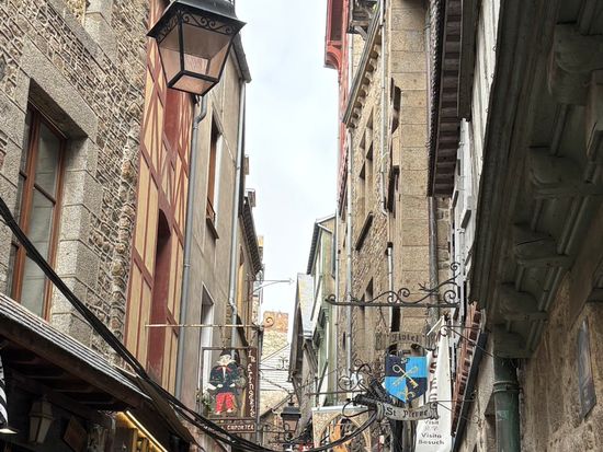 島の中に入ると、細くて入り組んだ石畳の道や坂道が続いていて、歩いているだけで中世の街にタイムスリップしたような感覚になる。お土産屋さんやレストランも並んでいるけれど、それすらも景観に溶け込んでいて、観光地っぽさよりも“物語の中の街”という印象のほうが強かった。上へ上へと登っていくにつれて景色が開けていき、振り返ると広大な干潟や海が広がっていて、そのスケールの大きさに圧倒される。