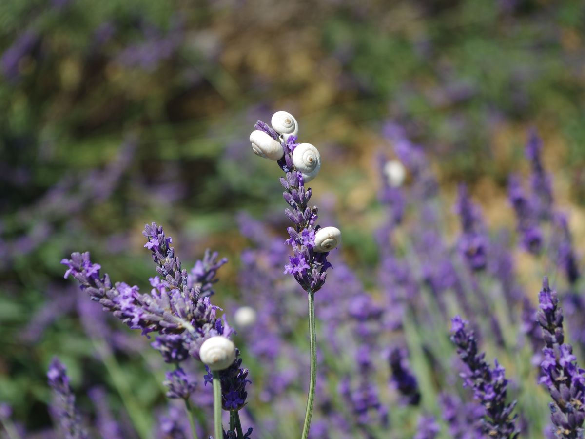 ラバンジンの花には、白い小さなカタツムリがたくさん集まっていて、紫の花にさらに白い花が付いているようで、緑と紫と白の色彩のコントラストが鮮やかで印象的でした。