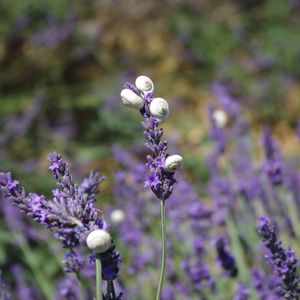 ラバンジンの花には、白い小さなカタツムリがたくさん集まっていて、紫の花にさらに白い花が付いているようで、緑と紫と白の色彩のコントラストが鮮やかで印象的でした。