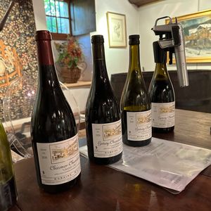 栄光の3日間も終わりシーズンオフ直前の時期にツアーに1人で参加しました。知識豊富なガイドさんのお話しを聞きながらワイナリーでの試飲2か所とランチと盛りだくさんの1日でした。フランスではこの時期コロナに関する規制は既に無いようでマスクをしている人もほぼいないような状況でした。ツアーは朝10時開始。ディジョンの宿泊しているホテルまで迎えに来ていただきました。車でコートドールに向けて出発!ディジョンの市街を抜けるとまもなくしてワイン畑が始まります。最初のワイナリーはシャンボルミュジニーにあるBoursot Père et Filsさんで赤ワインを中心に試飲(20ユーロ)。コートドニュイで初めて味わうワインに感慨を覚えつつランチの場所へ移動。ジュブレシャンベルタンにあるワイナリーさん、Domaine Trapet Père et Filsでワイン付きのランチを頂きました。4種のワイン付きのコース(70ユーロ)を頼みましたがせっかくなのでChambertin grand cru を15ユーロで追加していただき最高のワインも飲ませて頂きました。よくよく考えるとワイン5種プラスランチで85ユーロはお得過ぎ!午後はさらにボーヌ方面に向けて南下。途中ロマネコンティの畑などで記念撮影したりしながら道中色々とワインのお話しを聞いて勉強できました。Château de Chassagne-Montrachetでは今度は白ワインを中心に試飲(10ユーロ)。樽を貯蔵してある蔵を覗いたり、果汁を貯蔵するタンクを眺めながら改めて基本的なワインの製造課程を学びました。こうしてあっという間に1日が過ぎてゆき、天候は雨が降ったりしたものの、時折晴れ間がのぞいて虹が出たりしてブルゴーニュの色々な景色が観れてより印象深いツアーになりました。最後は無事に何事もなく17時過ぎにホテルに送り届けて頂きツアー終了。ブルゴーニュを満喫できる本当に満足のいくツアーだったのでぜひ他の皆様にもお勧めしたいです!どうもありがとうございました。