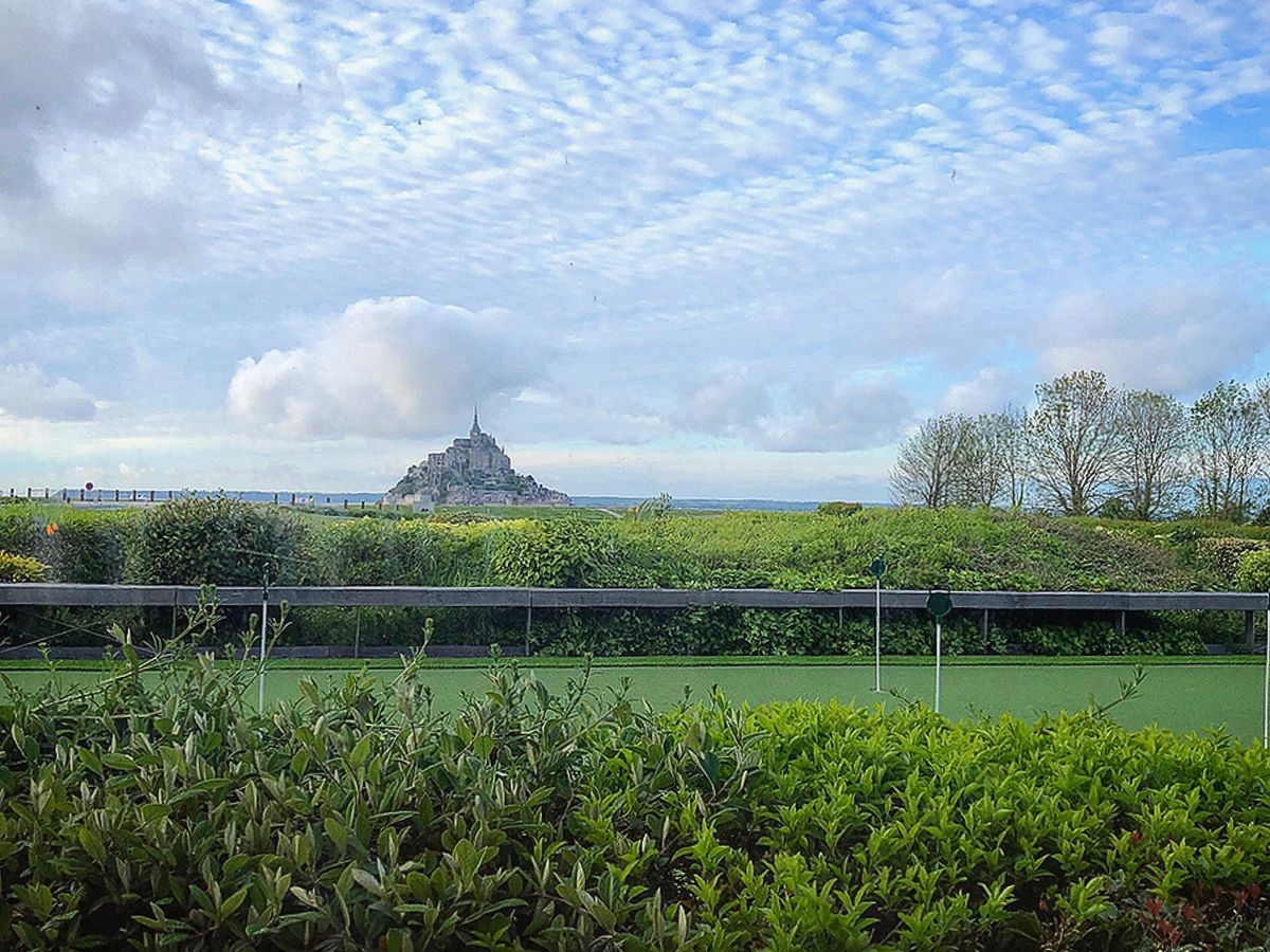 外にある畳んだパラソルの陰で、モンサンミッシェルが丁度見えないの席に案内されるが、断り見える席を希望しました