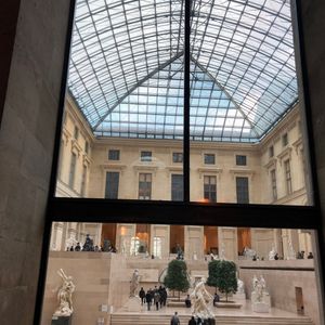 あまりにも広すぎて個人で効率よく周るのは難しく、最近はミュージアムパスですら入場が難しいとの事でしたので参加しました。マイバス社集合、徒歩でルーブル美術館に向かいます。超有名なピラミッドを外から撮影した後、地下へ。グループ専用入り口に並びましたが、長蛇の列で且つなかなか動かない。