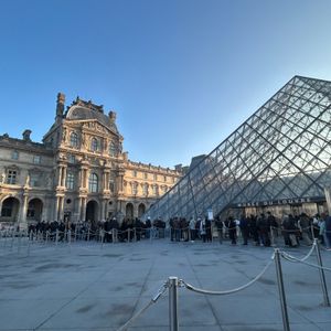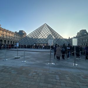ルーブルの集合場所など不安に思いながら現地到着し、ピラミッドの周りの入場時間が表示されたプレートごとの行列に並びました。