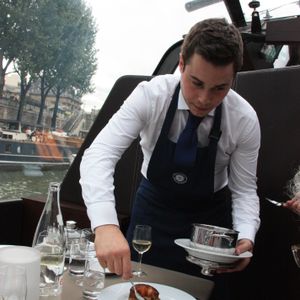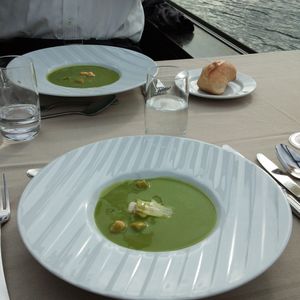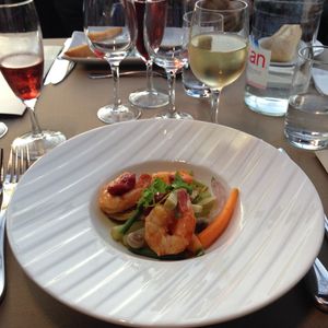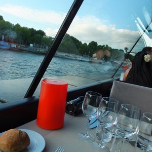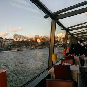 窓際の席で見晴らしはよかったけれど セーヌ川からの景色がいまいちでした。おそらく視点が低い為と思いますが 2階建てのクルーズがBESTと思います。(ディナークルーズではないかもしれませんが) 料理は普通でしたが 牛肉が焼き過ぎ(ミディアムで頼みましたがウエルダンで来ました)で固かったです。オーダーするときは ミディアムレアーかレアーにしたいと思いました。サーブの時間配分が悪く 下船直前にデザートが来ました。クルーの接客態度はとてもよかったです。