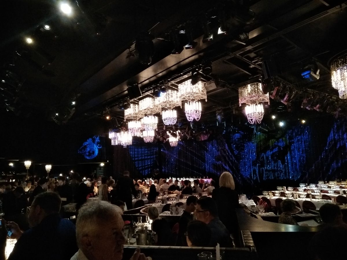 一か月前くらいに申し込んだ所為か、多分190ユーロの席の最前列(ショーが始まると私たちに前の席が沈み込んで行きました。前の席は何故かインド人の団体が多くやはりカレーを食べていました)でステージ先端まで15mちょっとぐらいで中央やや右手の所に案内されました。食事は若干慌ただしかったものの十分美味しく、ショーは左程嫌らしくなく綺麗で堪能しました。一度は行ってみるべきと思います。