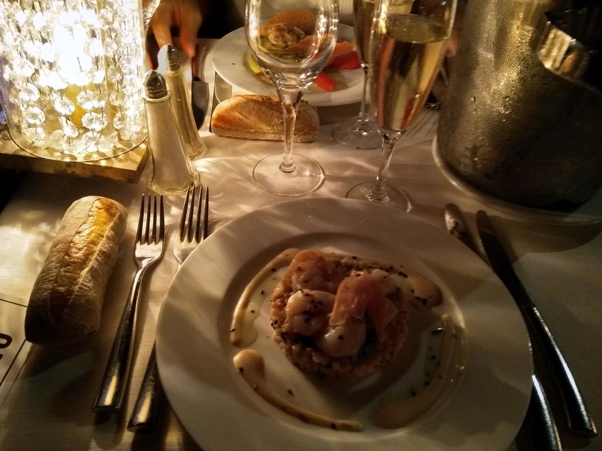 オルセー美術館から夕刻のセーヌ川添いを散歩しながら徒歩約40分。夜8時にチェックインしました。こちらのベルトラさんで、リリックコースを予約済み。プリントアウトしたクーポンを見せると、席をピアノの真横の席を案内されました。赤を基調としたお店に生演奏が流れるなか、オードブルが出され、飲み物リストから赤ワインをボトルでオーダーしました。(これは料金に含まれていない、5000円くらい)。週末の店内の席は各国からの観光客で満席、日本人は私達だけでした。私達はフランス語はさっぱりですが、英語で意思疎通がとれてスムーズでした。それから10分~15分おきにウェイターやウェイトレスさんがオペラを歌い始め、その場の全員が大盛り上がり。夜10時になると、プロセッコ(イタリアのスパークリングワイン、これは料金に含まれている)で乾杯。ヴェルディ作のオペラ椿姫~乾杯の歌で、皆で盛り上がります。