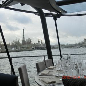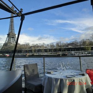 朝10時からエッフェル塔に登って、その後こちらのランチクルーズに参加しました。エッフェル塔から、船の乗り場まで歩いて5分くらいなので、便利でした。パリ自体3度目でしたが、セーヌ川クルーズは初めてだったので、新鮮で良かったです。船も新しくてキレイ、食事は量もけっこうありましたが美味しかったです。クルージング中は、女性のシャンソンの歌手(?)の方の歌を聴きながら、良い雰囲気でした。服装は、オシャレするに越したことはないけれど、カジュアルでも全然平気です。カメラマンが、各テーブルごとに写真を撮りに来ます。買わなくても良いのですが、なかなかよく撮れていたので、買ってしまいました。客層は、たまたまかもしれませんが、欧米系の方が99%くらい、アジア人は我々2人だけでした。12月上旬の参加で、街の気温はだいぶ寒かったですが、船の中は、暖房がしっかり効いていて快適に過ごせました。