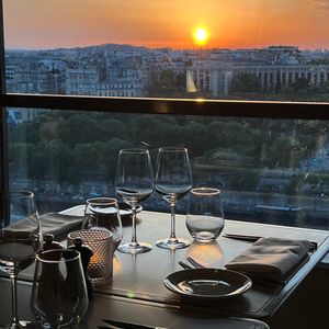 パリ旅行がパラリンピック開催期間中に被ってしまい、メトロの封鎖などで動き辛い時期ではありましたが、エッフェル塔でディナーをしたくて予約しました。スマートカジュアルなのでみすぼらしい格好で無ければ大丈夫ですが、スーツやドレスでバッチリ決めた人たちもたくさんいました。18時半からの回で予約していましたが、塔の麓にあるマダムブラッスリーの受付建屋に18時にバウチャーとチケットの引き換えが要ります。そこから予約者専用のエレベーターでエッフェル塔へ上がりますが、それでも待ち時間はあります。なので時間厳守で受付してください。窓側が内側より1万円くらい高い席ですが、一番窓際ではなかったのは残念。一番窓際に位置する2組は誕生日ディナーで予約していたからでしょうか?2人で7万弱はかなり高級なのですが、食事はいたって普通のコースでした。これは場所代が全てって感じの金額設定だと思います。その点では「一度は経験!」という事で納得しております。食事の後はセーヌ川クルーズを予約していて、降りるエレベーターがまた列をなしていたから、階段で降りて向かいました。
