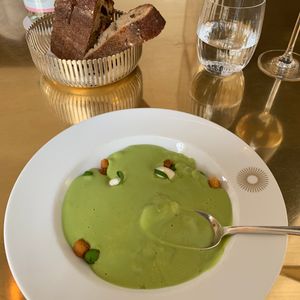 前菜の温かいスープとメインのリゾットは予め用意されていたのか冷めていました。