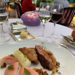 食事は普通に行けば22ユーロのランチコースと同じです。それにミネラルウオーターとワイン(私たちは飲まないのでジュース)と食後のコーヒーが含まれてます。オーダーを取ったウエイトレスに宮殿入園のチケットの話をしましたが「出来ない。」と口コミ通り言われました。困っていたらレストランに入れてくれた長身の男性に伝えるとチケットを持って来てくれました。