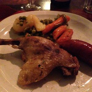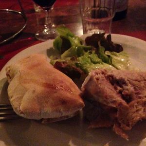 豚肉のパテ?意外と美味しいです。出てきた中で一番はウインナーですね。洞窟の中のようなレストランの雰囲気は百点です!